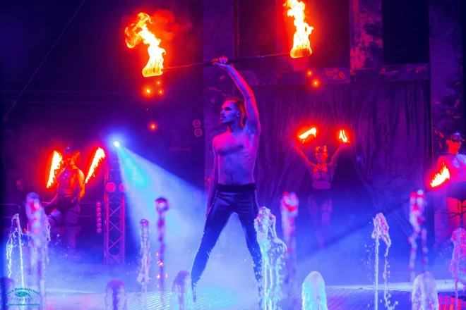 В этот вечер состоится цирковое шоу на воде с откровенными костюмами артисток, огромным бассейном на 170 тонн, который украшает 24-метровый световой фонтан.