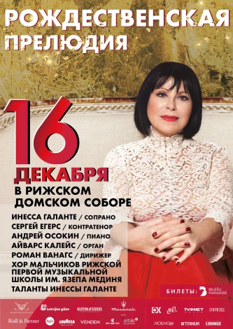 В этот день на самом впечатляющем по звучанию инструменту в Латвии - на органе Домского собора - прозвучит музыка в исполнении всемирно известного композитора и органиста Айварса Калейса и виртуозного пианиста, лауреата престижных международных конкурсов Андрея Осокина, а также выступит выдающийся контратенор и исполнитель барочной музыки Сергей Егерс. Одним из самых долгожданных событий концерта станет выступление великой оперной дивы Инессы Галанте. В программе примут участие восходящие звезды, лауреаты конкурса "Таланты Инессы Галанте". Неизменным будет и участие хора мальчиков Рижской первой музыкальной школы имени Язепа Мединя под руководством Романа Ванагса, что всегда дополняет трогательную и волшебную ауру Рождественской прелюдии.