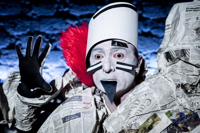 В его «UBU» оживают визуальные мотивы Миро, газетная бумага превращается в материал для костюмов и декораций, а куклы из легендарного Mori el Merma входят в новую сценическую вселенную. Перед зрителем возникает живописный, пульсирующий мир: многоязычная пантомима, не требующая перевода; световые рисунки — то рубиновые, то ультрамариновые; танцевальные фрагменты рядом с хаосом и кровопролитием; сюрреалистические объекты; гротескные персонажи; медведь из постановки Жарри, приветствующий зал. Это не спектакль — это движущееся полотно, созданное художником, для которого сцена всегда была территорией чистого искусства.