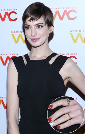 На вручении премий Women's Media Awards 2012 Энн демонстрировала классический маникюр с красным лаком, однако ноготь безымянного пальца левой руки был покрыт белым. Отличный способ привлечь внимание к обручальному кольцу новобрачной!