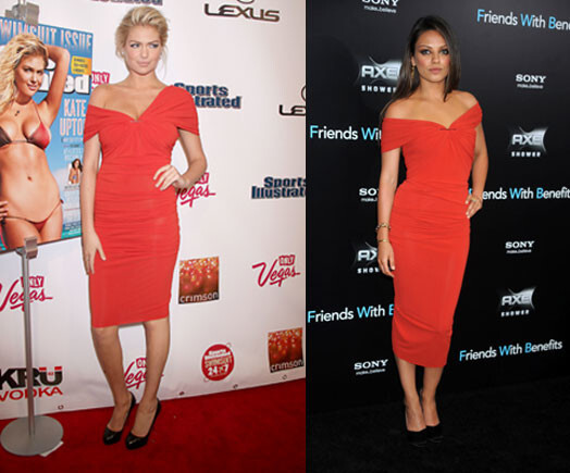 Семь месяцев спустя, 14 февраля, точно такое же платье для презентации обложки выпуска журнала Sports Illustrated, посвященного купальникам, надела девушка с обложки этого издания, модель Кейт Аптон (19). В качестве аксессуаров она выбрала черные туфли Christian Louboutin (460 евро) и бриллиантовые серьги в ушах.