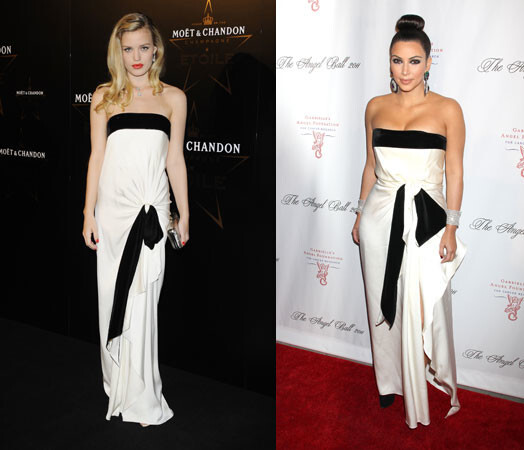 Первой это платье выгуляла востребованная модель Джорджия Мэй Джаггер (19) — дочь лидера The Rolling Stones Мика Джаггера и супермодели Джерри Холл. 19 сентября она побывала в нем в Park Lane Hotel в Лондоне на церемонии Moet & Chandon Etoile Award, во время которой чествовался фотограф Марио Тестино. Блестящий клатч, ретро-прическа и мейк-ап с акцентом на ярко-красные губы довершили образ.