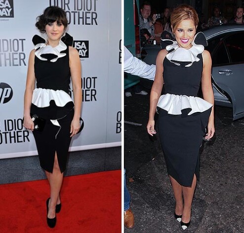 Популярная британская певица Шерил Коул (28) выбрала такое же платье для посещения премьеры мюзикла «Шрек» в королевском театре Drury Lane в Лондоне в начале октября. Черно-белые туфли довершали ее образ.