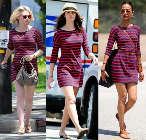 Голливудские звезды просто помешаны на этом ничем особо не примечательном платье Express за 50 долларов ― его уже надевали звезда «Призрака оперы» Эмми Россум, актрисы Оливия Манн и Аманда Сейфрид, а также дизайнер Никки Хилтон. Вот еще одна «группа в полосатых купальниках»!