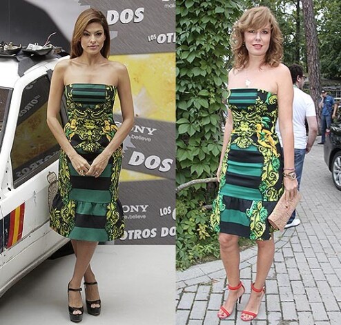 Латвийская бизнес-леди Бенита Садауска (43)выбрала точно такое же платье для посещения фестиваля «Новая волна-2011» 29 июля этого года. Она подобрала к наряду коралловые босоножки и клатч Yves Saint Laurent с принтом из красок (506 евро).