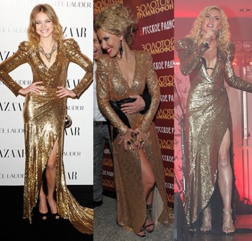 Золотое платье Balmain с разрезом из осенней коллекции 2010 года украсило десяток оболожек глянцевых журналов во всем мире и было выгуляно многими модницами, которым не жалко потратить на него 20 000 евро. Перед вами только три из них.