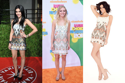 Три молодые, но уже очень известные по разным причинам девушки надевали это расшитое пайетками платье All Saints (338 евро) с «ацтекским» принтом.