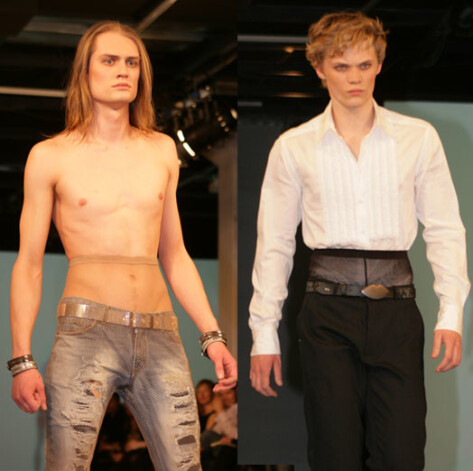 На показе осенне-зимней коллекции дизайнера Тома Ребла, который завершал 14-ю Riga Fashion Week, модели продемонстрировали новый тренд ― торчащие из-под брюк колготы. А у некоторых моделей колготы в сеточку были надеты прямо поверх джинсов. Мальчики, берете на заметку!