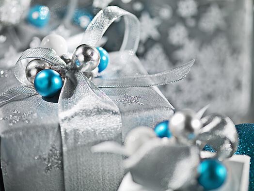 * Игрушки на упаковке. Небольшие подарки будут неплохо смотреться, если их завернуть в простую упаковочную бумагу. А создать праздничное настроение упаковке помогут маленькие елочные шарики и яркие, блестящие флористические ленты.