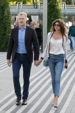 Пара одета достаточно гармонично, хотя в стилистике их нарядов есть легкая нестыковка: как будто жена только что сошла с палубы яхты, а муж приехал за ней с работы. Этого диссонанса можно было избежать, если бы Ефим надел не фиолетовую, а белую, голубую, темно-синюю или даже, чем черт не шутит, полосатую футболку. Тогда одежда супругов была бы более созвучной друг другу. Но на самом деле это все ерунда! Истинные отношения в паре транслирует не одежда, а «язык тела» — жесты, позы, взгляды. И вот по этому признаку сразу видно, что перед нами абсолютно гармоничная пара.