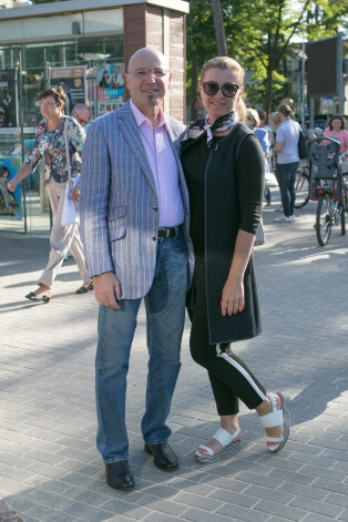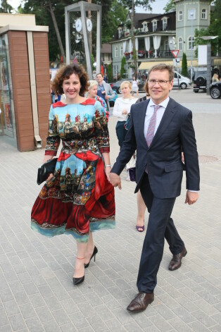 Мне очень импонирует эта пара и все ее выходы в свет. Бернхард и Светлана всегда тщательно продумывают свой совместный дресс-код и воспринимаются окружающими именно как пара, как единое целое. На сей раз их наряды согласованы и по цвету, и по тематике: полосатый мотив вызывает ассоциации с морским стилем, столь уместным в Юрмале. В то же время в их одежде нет чрезмерной надуманности, «сделанности». Когда жена подбирает шарфик в тон к носкам мужа, — это, на мой взгляд, перебор. Здесь же есть ощущение непринужденности, даже легкого пофигизма. И это здорово!