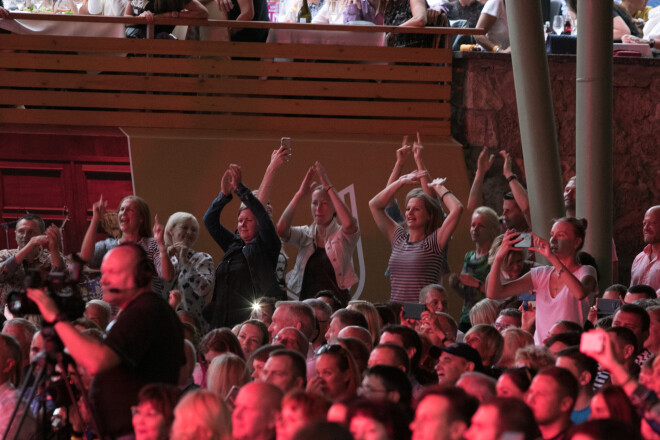 Послушать любимые хиты пришло множество поклонников "Ленинграда", среди которых оказался и посол Российской федерации в Латвии Евгений Лукьянов с супругой.