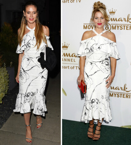 Кэндис в точно таком же платье в конце июля позировала на вечеринке телеканала Hallmark в Лос-Анджелесе. Яркий клатч Kate Spade New York и босоножки Stuart Weitzman довершали ее облик.
