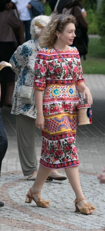 Здесь все хорошо по отдельности — отдельно платье, отдельно аксессуары. А вместе — перебор: слишком много активных элементов. Сумочка и туфли просто изумительные, такие вещи должны солировать в ансамбле, а не довольствоваться ролью массовки. А здесь яркое агрессивное платье их просто уничтожило. Очень жаль... Хотя если у этой дамы была цель привлечь к себе внимание, то она ее, безусловно, достигла.