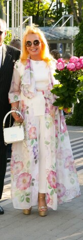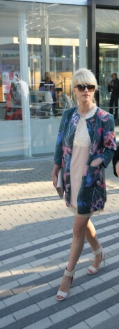 Поскольку цветочная одежда и так перегружена композицией, желательно приглушать ее с помощью нейтральных предметов гардероба. Дайна именно так и поступила, позволив цветастому жакету играть роль первой скрипки.