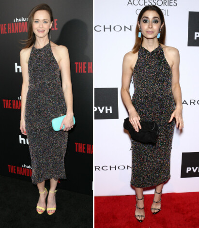 Первой в таком наряде на премьере сериала «Рассказ служанки» в Лос-Анджелесе в конце апреля этого года была замечена Алексис Бледел (35). Она сделала ставку на яркие аксессуары — голубой клатч Lili Radu и желтые босоножки Schutz.