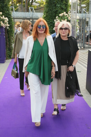 Белый брючный костюм может играть роль «первой скрипки», а может быть «аккомпанементом» — перед нами явно второй случай. Весь акцент здесь сделан на интересный ярко-зеленый топ необычного кроя, а белый костюм его прекрасно обрамляет. Интересная форма очков добавляет этому комплекту нотку актуальности.
