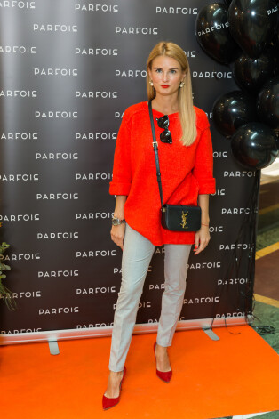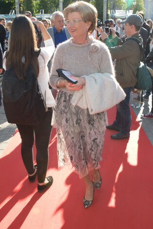 Сочетание джемпера с шифоновой юбкой — это очень модно, так что госпожа депутат, что называется, в теме. Правда, трикотаж здесь выглядит слишком романтично, да еще эта жуткая розочка... Гораздо лучше здесь смотрелся бы джемпер более грубой фактуры и более жестких очертаний.
