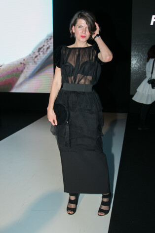 Прозрачный топ, надетый поверх черного бюстгальтера, похоже, стал бестселлером сезона. Но здесь он представлен, пожалуй, в самом необычном виде. Прозрачность здесь — лишь легкий эротический штрих, «вишенка на торте». Акцент сделан не на нем, а на общем силуэте — женственном, романтичном, немного в духе моды эпохи модерна.