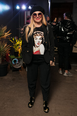 Берет — самый популярный головной убор этой осени, и, судя по всему, он сохранит свою популярность еще долго. Почему? Да потому что он невероятно демократичен, подходит практически всем и отлично вписывается в любой стиль — от эпатажно-рокерского до элегантно-буржуазного. В данном случае берет несет в себе явную бунтарскую нотку. Вот только портрет Мэрилин Монро здесь явно лишний — задора и так хватает.