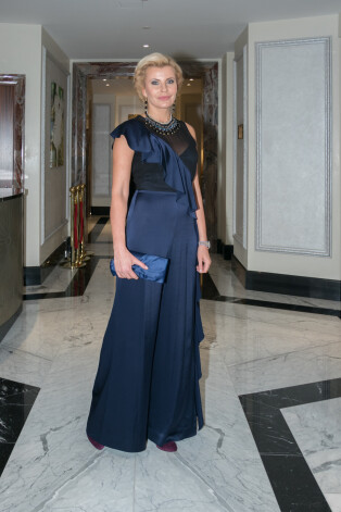 Гламурный статусный наряд, одновременно строгий и сексапильный. Брюки-юбка мягко ниспадают по фигуре, красиво облегая ее. Естественно, такой фасон могут позволить себе лишь обладательницы пропорциональных и стройных фигур: любые лишние выпуклости здесь будут сразу бросаться в глаза. К платью претензий нет — оно сидит великолепно, а вот колье, на мой взгляд, лишнее. Рюша на лифе уже сама по себе эффектное украшение.