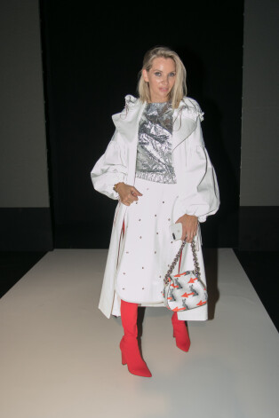 На первый взгляд, немного странное сочетание цветов, хотя на самом деле оно классическое — белый, серый и красный. Просто в качестве серого здесь выступает серебристый, что сразу придает образу футуристическую окраску. Очень смело, необычно, ярко. Всем подряд я бы такое не рекомендовала. Образ для «продвинутых».