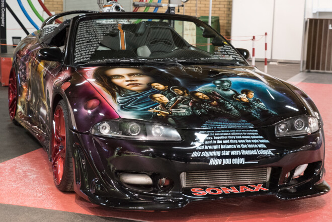 В детской развлекательной зоне выставки “Auto 2018” все желающие смогли осмотреть автомашину, переоборудованную по мотивам космической саги “Звездные войны”. В ее оформлении отражены все персонажи легендарного фильма – магистр Йода, принцесса Лея, Дарт Вейдер и др. Это уникальное чудо техники и дизайна, воплотив свою давнюю мечту, построил на базе японского спортивного автомобиля 90-х годов “Mitsubishi Eclipse” шведский поклонник “Звездных войн”. Сложнее и дороже всего была покраска кузова методом аэрографии, обошедшаяся в 20 тысяч евро.