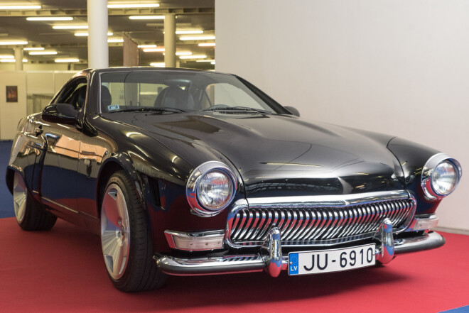 Еще один интересным участником экспозиции стал родстер “Mercedes-Benz SLK” с панелями кузова “ГАЗ 21 Волга”, созданный тут же в Латвии художником по металлу Нормундом Берзиньшем. В результате получилась “Волга” с опускаемой крышей! И это вовсе не металлическая скульптура, а пригодный для движения по латвийским дорогам автомобиль, зарегистрированный в Дирекции безопасности дорожного движения и успешно прошедший техосмотр благодаря сохранению оригинальных габаритов кузова, двигателя и трансмиссии “Mercedes-Benz SLK”.