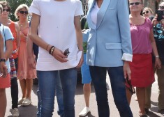Для такого торжественного случая первая леди Франции надела короткое стильное платье своего любимого бренда Louis Vuitton и дополнила образ синими туфлями на шпильке и часами Michel Herbelin.