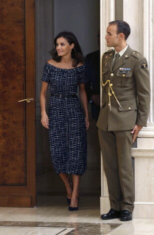 На встречу супруга короля Испании явилась в твидовом темно-синем платье, которое подчеркнуло ее изящные плечи. Свой образ Летиция дополнила черными лодочками и минималистичным поясом в тон. Ее наряд выглядел дорого и благородно.