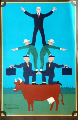 Именно в жанре плаката Юрис Димитерс в свое время получил наибольшее признание. В 1987-м году, после многочисленных побед на международных конкурсах, он даже вошел в число 60 лучших плакатистов мира. Во времена СССР его плакаты выглядели чрезвычайно остро и смело. При этом большинство из них выполнялись как госзаказы: за деньги партии и правительства Димитерсу удавалось не только решать свои собственные, вполне художественные, задачи, но даже прятать фигу в кармане. В итоге плакат на какую-нибудь типично совковую тему вроде “Активнее включайтесь в соцсоревнование!” или “Повысим надои молока!” превращался в остроумное, яркое, стильное высказывание о чем-то большем. Кстати, жанру плаката Юрис остается верен и по сей день, просто вместе со временем изменились и темы его работ: теперь художник развенчивает идеалы капитализма.
