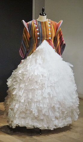 Что необычного в этом наряде? Пышное белое платье, которое издалека кажется шелковым, на самом деле изготовлено из 1 100 целлофановых пакетиков из обычного супермаркета. Другого и не стоило ожидать от Бруно Бирманиса – дизайнера, которого уж точно не назовешь банальным. В историю этот человек вошел как основатель Ассамблеи неукрощенной моды (1990-1999) – самого радикального модного шоу на всем постсоветском пространстве, куда в качестве гостей приезжали Пако Раббан, Эндрю Логан и Зандра Роудз, а в качестве участников – Андрей Бартенев, Юозас Статкявичюс и даже Александр Маккуин (в то время студент лондонского колледжа Сен-Мартин). Коллекция с интригующим названием «13 женщин, на которых я (еще) не женился», показанная Бирманисом в октябре 2011 года, стала своего рода посвящением Ассамблее. «Почти все, что я создавал, разошлось по коллекциям или кануло в небытие, – сказал тогда дизайнер. – То, что осталось, я решил передать в дар музею. Считаю, что наши дети должны знать историю нашей моды, а я – ее скромная часть».