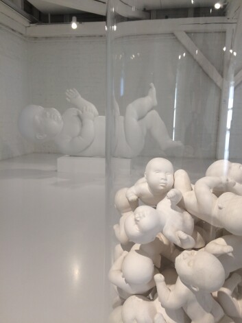 А куча пупсиков, заключенных в большую стеклянную колбу (эта работа называется “Пробирка”), вообще наводит на философские размышления.