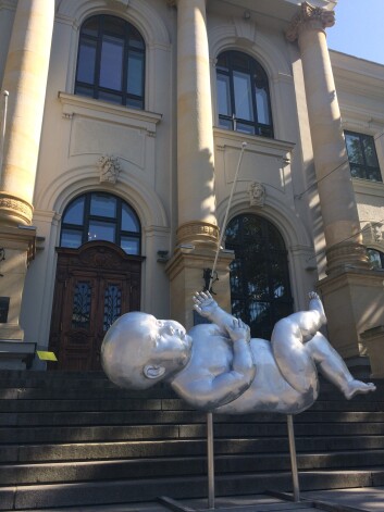 Огромный карапуз, появившийся на ступеньках Латвийского Национального художественного музея, - это не просто инсталляция, а приглашение на выставку “Лактация”, которая проходит в Купольном зале на пятом этаже музея. Выставка небольшая, но очень необычная, а местами и скандальная.