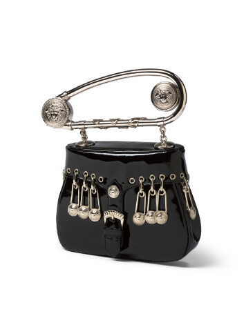 Знаменитая коллекция Джанни Версаче сезона весна-лето 1994, посвященная английской булавке, вошла в историю моды, как «сексуальная революция от Версаче». Особо известным в этой коллекции стало платье, в котором модель Элизабет Хёрли появилась на премьере фильма «Четыре свадьбы и одни похороны», – оно состояло из кусочков ткани, которые были словно не сшиты, а скреплены булавками. Конечно, Версаче был не первым, кто обратил внимание на булавку как на выразительный декоративный элемент, – до него это сделала Вивьен Вествуд. Зато у Версаче булавка стала символом не только раскованности и свободы, но и гламура. Сумка из черной кожи с ручкой-булавкой отлично передает эстетику этой коллекции.