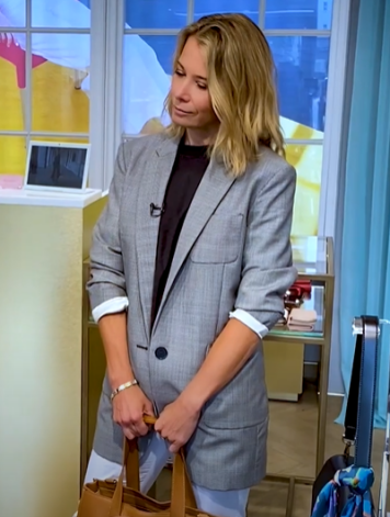 К своим туфлям Высоцкая также подобрала объемную сумку в похожих тонах. «И сумка удобная. Это и под ноутбук, и документы. И это история унисекс», — сказала она.