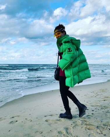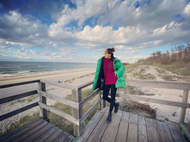 Знаменитость устроила на Куршской косе импровизированную фотосессию. Для прогулки Климова выбрала свитере-оверсайз малинового оттенка, черные джинсы-скинни и «армейские» ботинки. Чтобы не замерзнуть, многодетная мама накинула объемный пуховик мятного цвета. А завершением образа стал остромодный козырек от Dior.