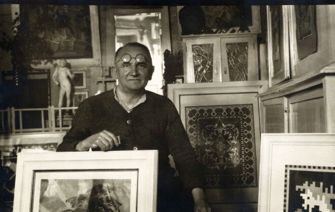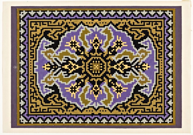 Как и многие художники эпохи модерна, Мадерниекс пытался выйти за рамки какого-то одного жанра. Он не делил искусство на “высокое” и “низкое” и с энтузиазмом занимался тем, что мы сегодня называем дизайном. Например, делал эскизы для ковров - подобных экспонатов на выставке больше всего.