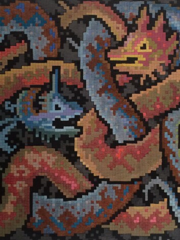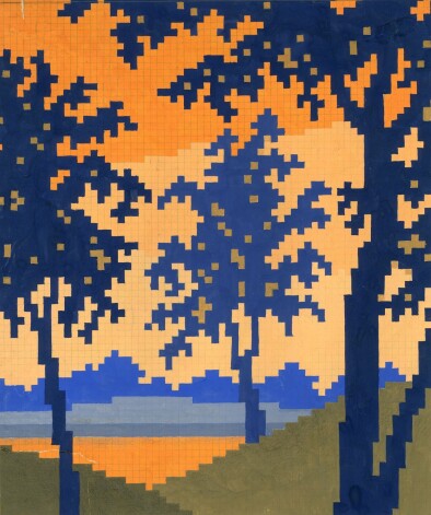 Задолго до компьютерной эпохи Мадерниекс создавал изображения, целиком состоящие из крохотных квадратиков. Сделано это было из сугубо практических соображений - только так рисунок можно было перенести на тканую основу. Но сегодня такой “пиксель-арт” смотрится удивительно современно.