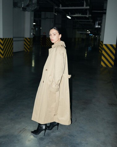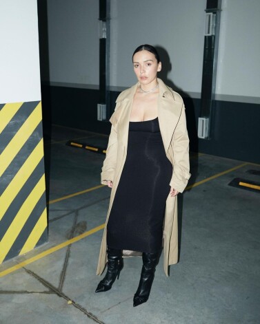 Экс-солистка группы SEREBRO Ольга Серябкина создала минималистичный женственный образ, сочетав бежевый тренчкот оверсайз с черным облегающим фигуру платьем с экстремальным декольте. Смелый наряд дополнили сапоги из черной кожи с острыми носами на высоком каблуке, минималистичные украшения и нюдовый макияж.