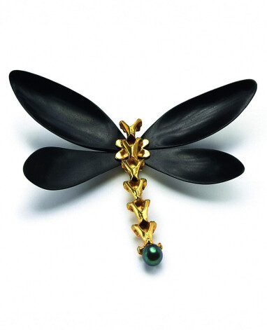 Ювелирная брошь Maija Vitola, позолота, эбеновое дерево, жемчуг