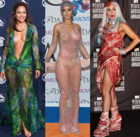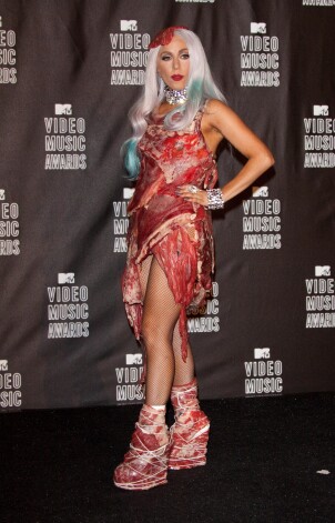 Эта подборка не могла обойтись без наряда королевы эпатажа Леди Гаги, у которой в ее бурном прошлом каждый выход на ковровую дорожку становился сенсацией. Но самым резонансным за всю историю образов певицы стало платье из сырого мяса дизайна Франка Фернандеса. На премии MTV в 2010 году певица появилась в кроваво-красном платье из кусков говядины, которое дополнила шляпкой, клатчем и обвязанными веревками туфлями из того же мяса.