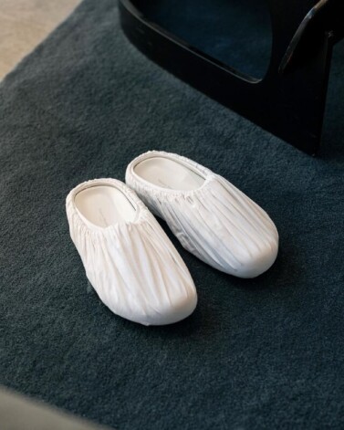 Белоснежные тапочки с необычным тканевым верхом, напоминающим по своей текстуре медицинские бахилы. Модель называется Surgical Slip-On Mule и стоит 530 евро.