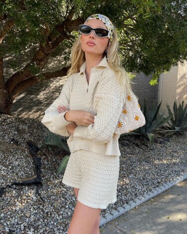 В пасхальные выходные манекенщица надела вязаный костюм молочного цвета, состоящий из джемпера с воротником и коротких шорт от бренда Mr Mittens.