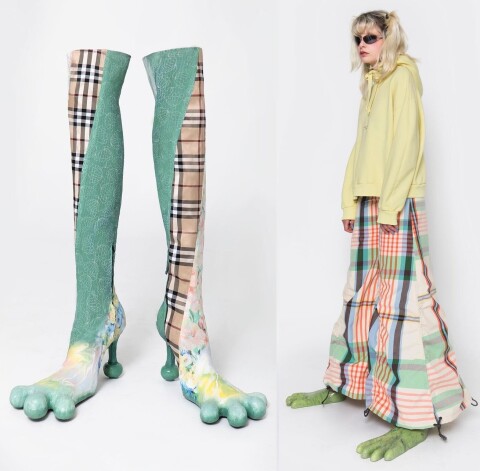 В серию вошли туфли, лоферы и ботфорты в виде монструозно огромных лап. Как и прежде, они сделаны с использованием нераспроданных тканей — на этот раз из остатков Burberry, Fendi, Jacquemus и других люксовых Домов. Таким образом дизайнер поддерживает идею экологичной моды.