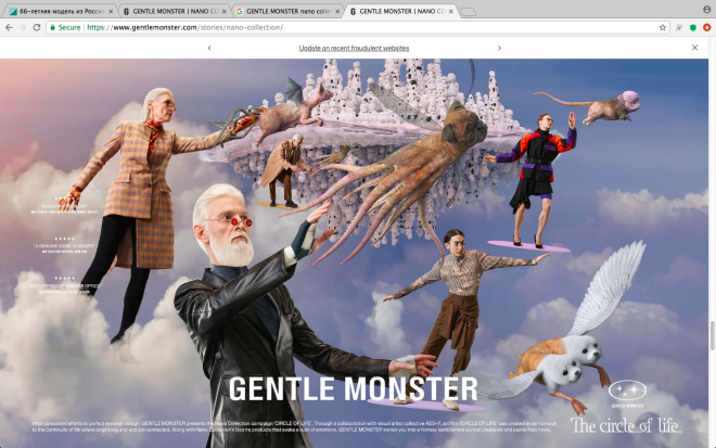 В рекламном ролике новой коллекции южнокорейского бренда оптики Gentle Monster можно увидеть и других седовласых красавцев из России - Сергея Арктику и Ивана Петкова. Все они состоят в модельном агентстве Oldushka, которое представляет моделей старше 50-ти лет.