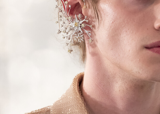 Как всегда, коллекция Gucci подана в агендерном ключе: строгие мужские костюмы носят девушки-модели, а соблазнительный трикотаж с оголенным плечиком или цветочные серьги в половину уха — модели-юноши.