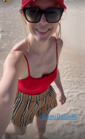 Для прогулки по берегу океана Наталья облачилась в ярко-красный топ и шорты бренда Burberry с завышенной посадкой, на эластичном поясе.