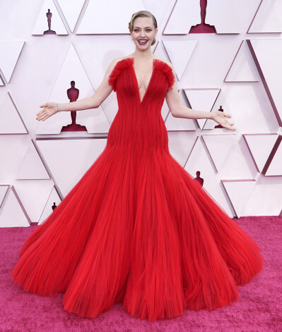 Одним из лучших нарядов церемонии стало ярко-красное платье Armani Privé актрисы Аманды Сейфрид. Это чудо кутюрного мастерства скроено так, что совершенно непонятно, на чем оно держится. Просто блеск!