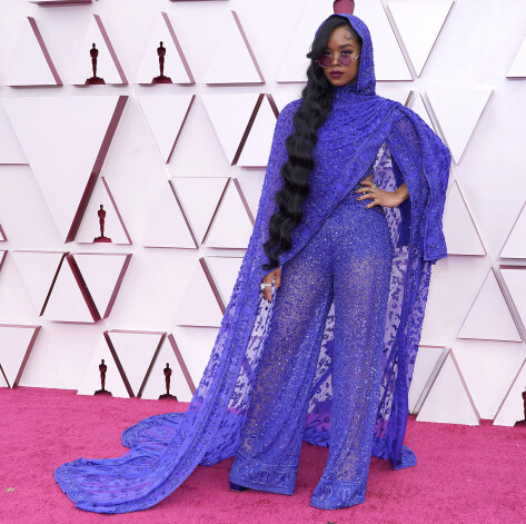 Певица H.E.R. (настоящее имя Габи Уилсон), претендовавшая на награду за лучшее исполнение песни, осталась без оскаровской статуэтки. Зато у нее есть другая, не менее престижная - недавно она получила “Грэмми”. Ну, и наряд у нее более подходящий для музыкальной церемонии. В похожем когда-то Принс пел свою знаменитую Purple Rain. В качестве оммажа принимается, но вообще-то этот кружевной комбинезон выглядит вопиюще немодно.